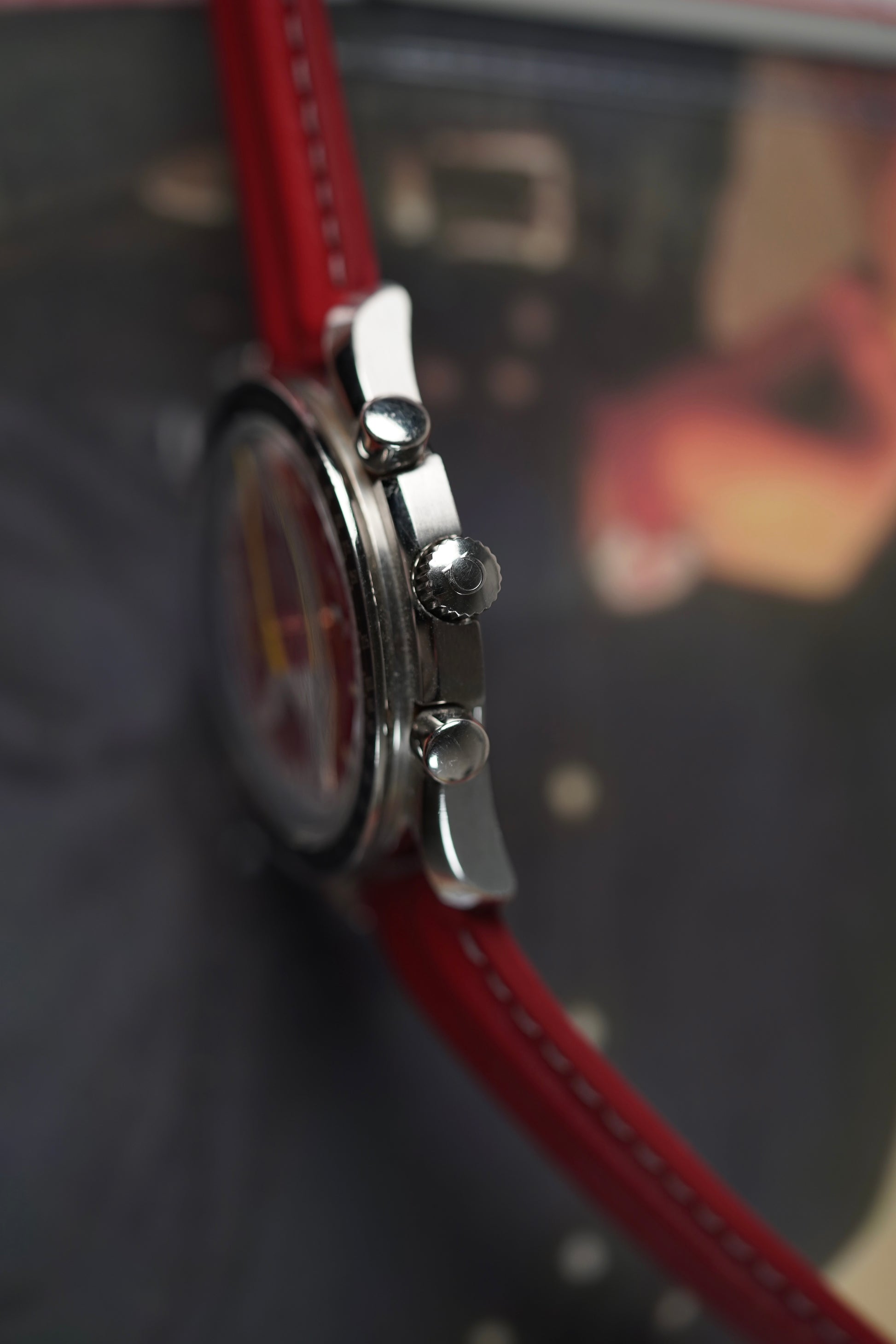 🔴 quadrante rosso smaltato, profondo e cangiante, con riflessi incredibili alla luce. Un colore audace, sportivo, che richiama immediatamente il mondo delle corse e l’estetica racing degli anni ’90.